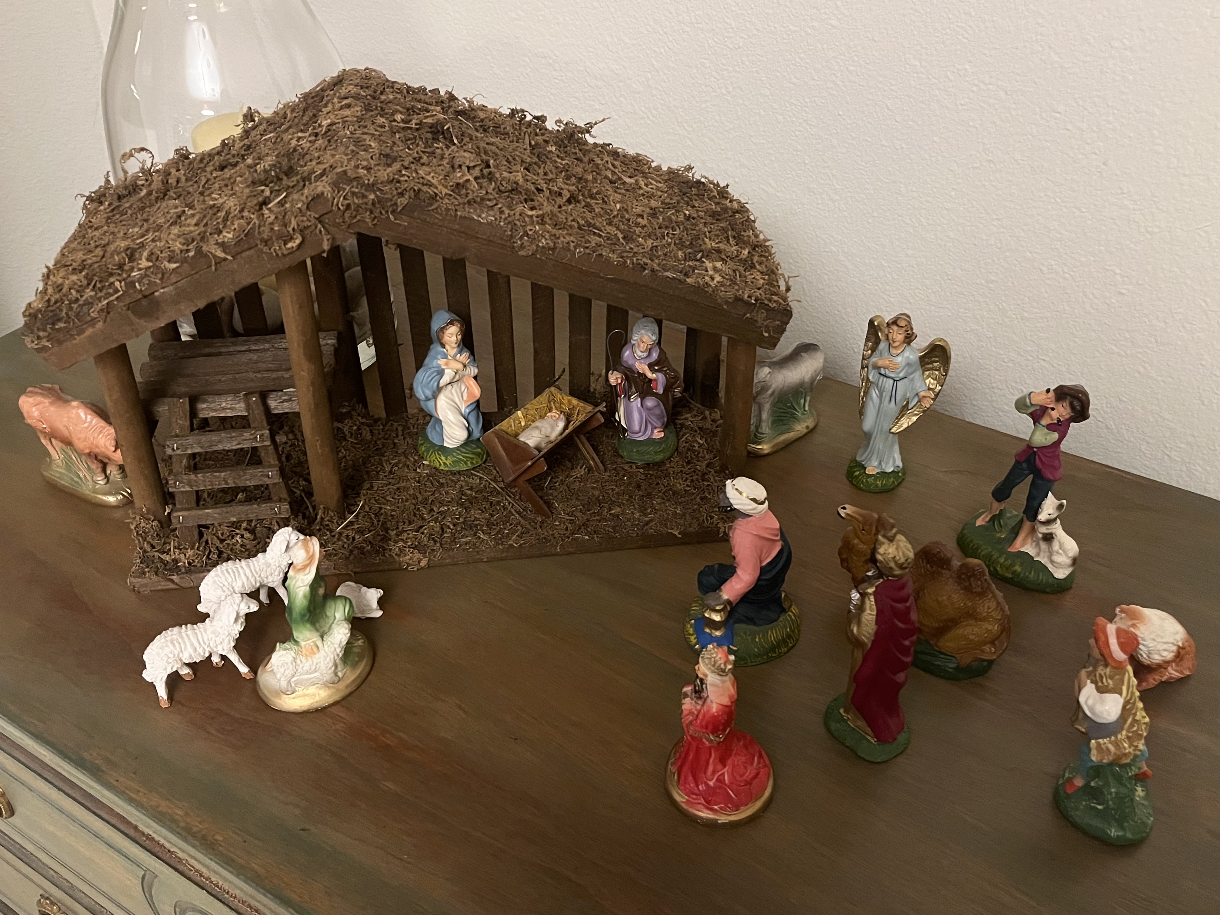 The decorating process unleashed memories from years back, memories of family events, memories of friends. The nativity set I grew up seeing at my grandparent’s house now lives at mine. Unwrapping each piece stirs memories from my childhood, when its home was a corner table in their living room. I treasure the story of how the set was acquired. First the stable with the holy family, then, as finances allowed, they added to the collection. The pieces don’t match, but they warm my heart as it’s part of my history. Several years back, my husband purchased a new stable for the set. It was our way of putting our own touch on this set.